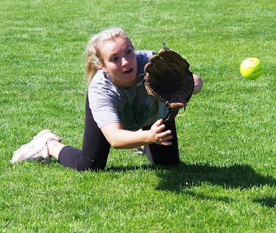 | Haley Jaman demonstrates a diving catch drill as a coach. |