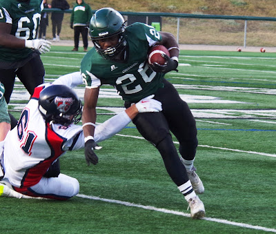 | Aulain Penner (#26) breaks out a tackle attempt by a defender. |
